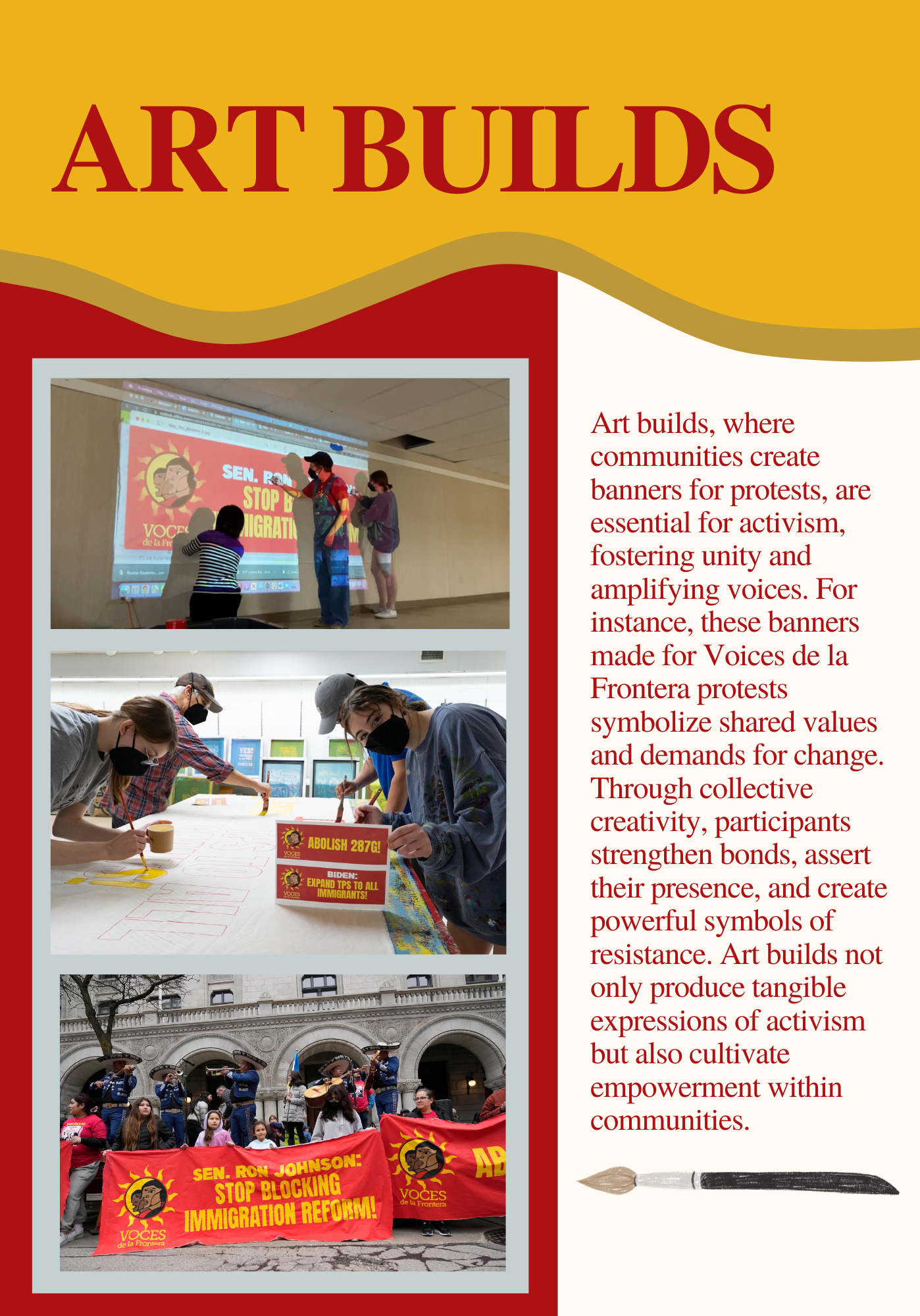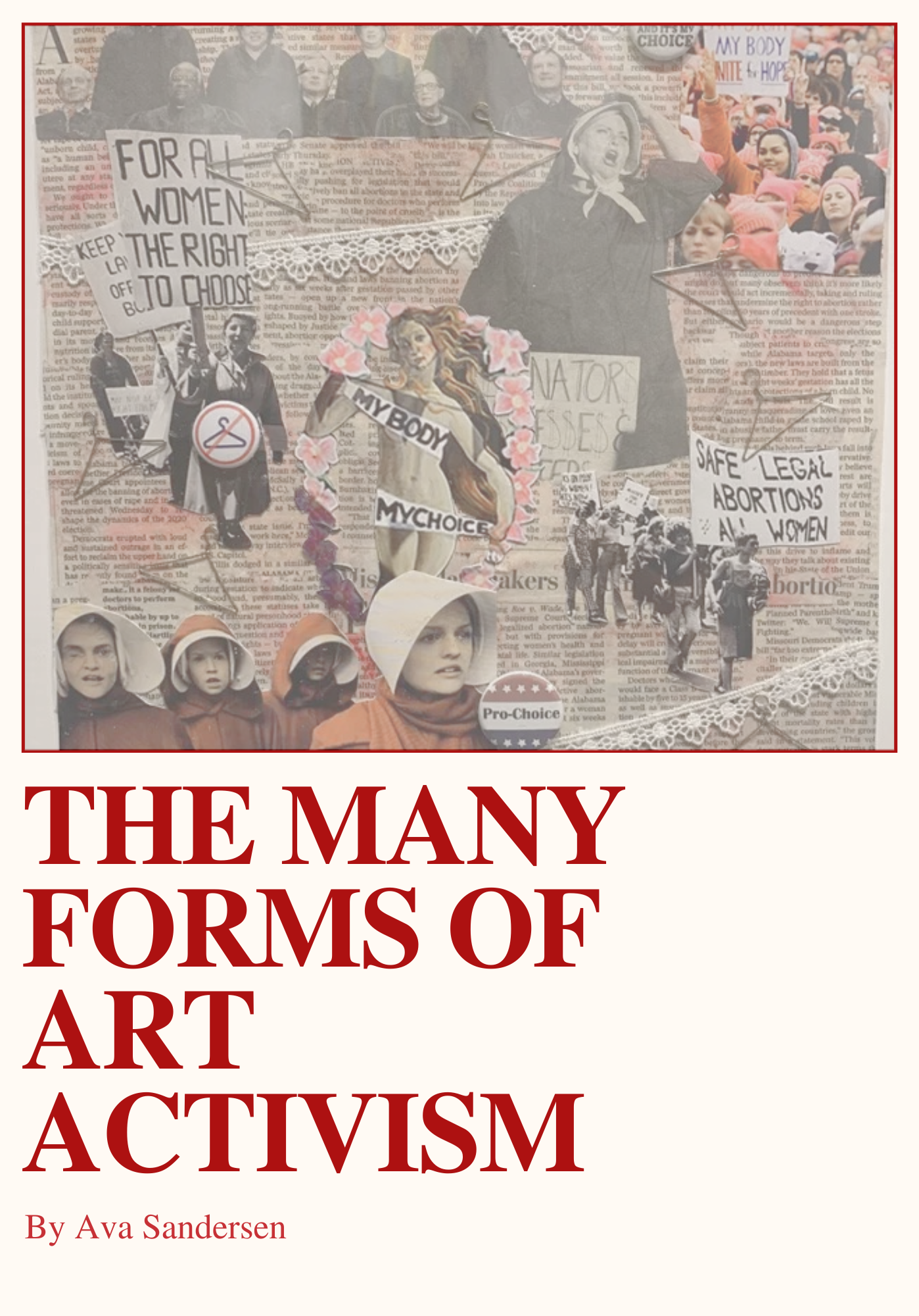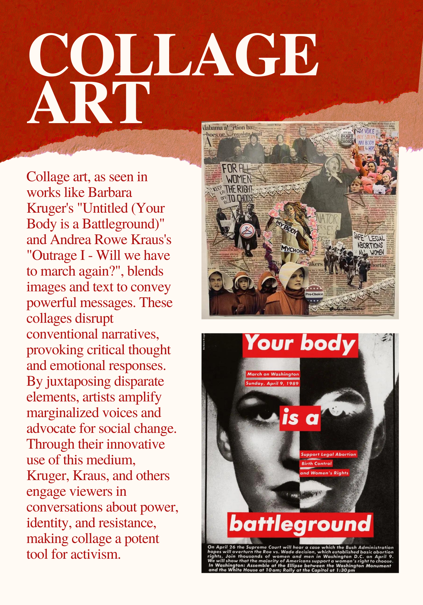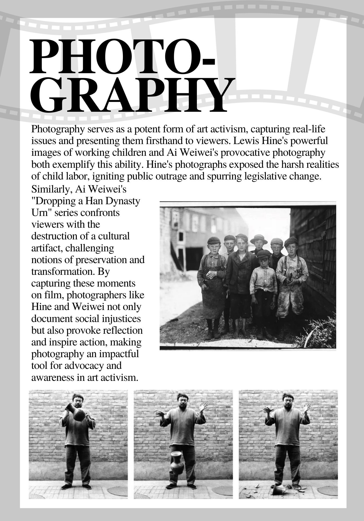 The inspiration for the visualization process stemmed in part from Ms. Robinson’s approach in Lattimer’s book, where students engaged in viewing and discussing historical drama photographs (Lattimer, pg. 31-32). I decided to incorporate a wide range of real-world examples of art activism. This decision was made with the intention of allowing students to deepen their understanding and appreciation of the concepts presented in the reading. By utilizing diverse examples, I aimed to create a zine that serves as a gateway for students to explore topics that are important to them, encouraging reflection and engagement with visual representations of activism. Furthermore, this visualization acts as a catalyst for inspiration and brainstorming for a future project where students will create their own art activism piece. Through this process, students are prompted to consider the various mediums available to them and even explore the possibility of combining different mediums to convey their message effectively.