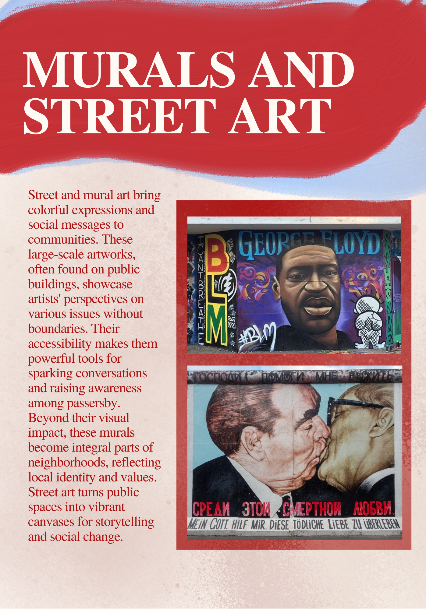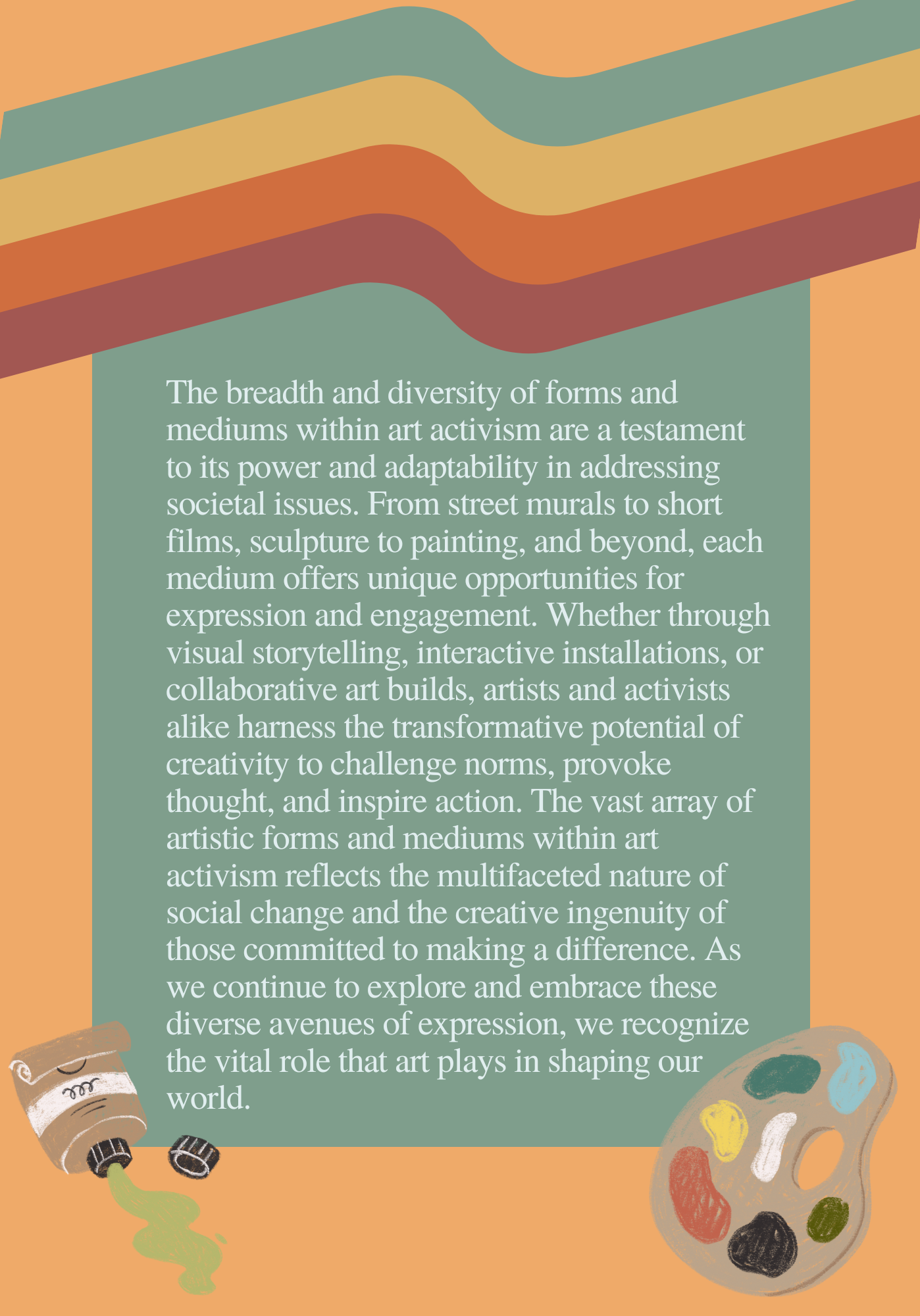 Creating the visualization for my zine project was a deliberate and thoughtful process that involved carefully selecting both the images and the digital platform. I made the decision to curate a diverse collection of images and artworks representing various mediums from different movements and forms of activism. This selection aimed to provide students with a comprehensive visual representation of art activism, highlighting its multifaceted nature and profound impact on society. Additionally, I chose Canva as the digital platform for its accessibility and visually engaging features. Canva’s user-friendly interface allowed me to create dynamic layouts and incorporate interactive elements, such as clickable links and pop-up descriptions, that enhance the learning experience for students by encouraging exploration and interaction.