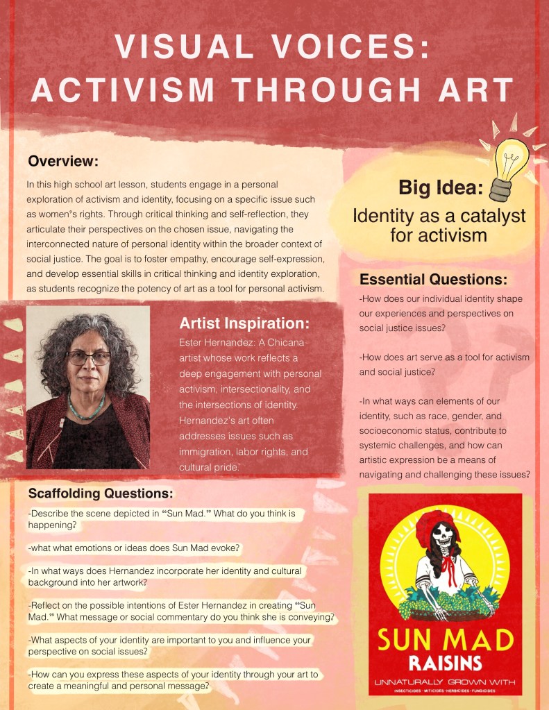 I feel this may be a good example to accompany my lesson as well, and decided to include it as well, with this being my art education blog! Below is another lesson plan I have done about art activism, with a focus on Ester Hernandez’s work, Sun Mad Raisins.